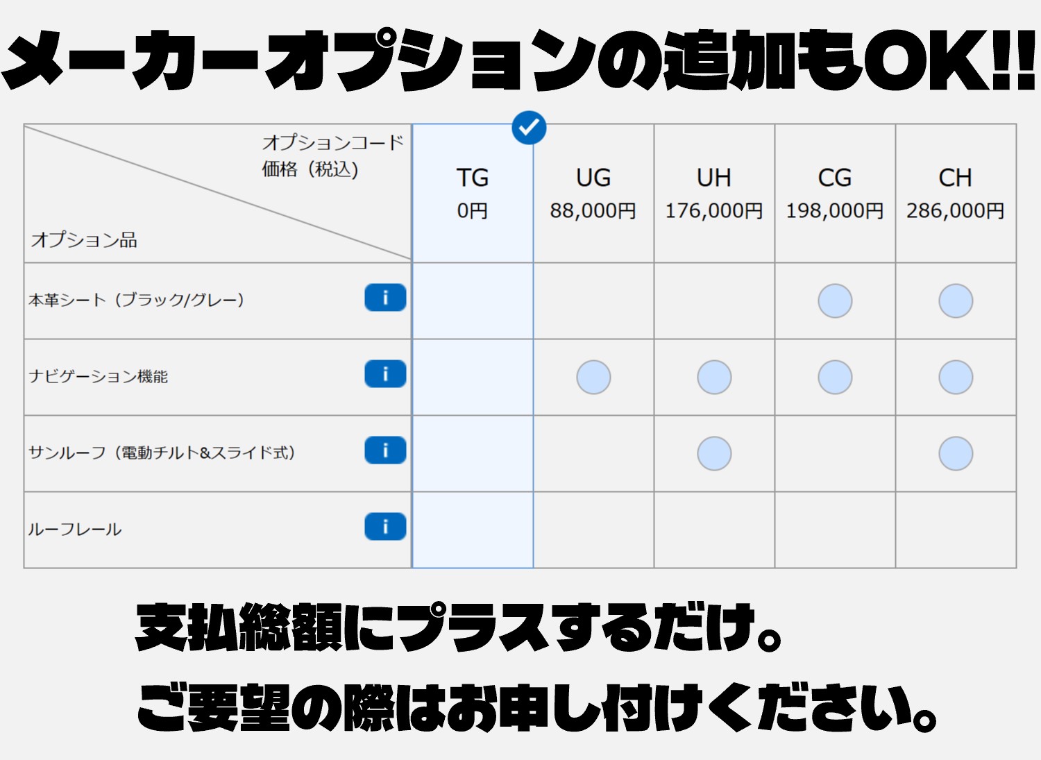 | 支払総額(税込) | 3,389,000 円 | 3,464,680 円 | 3,468,800 円 |
