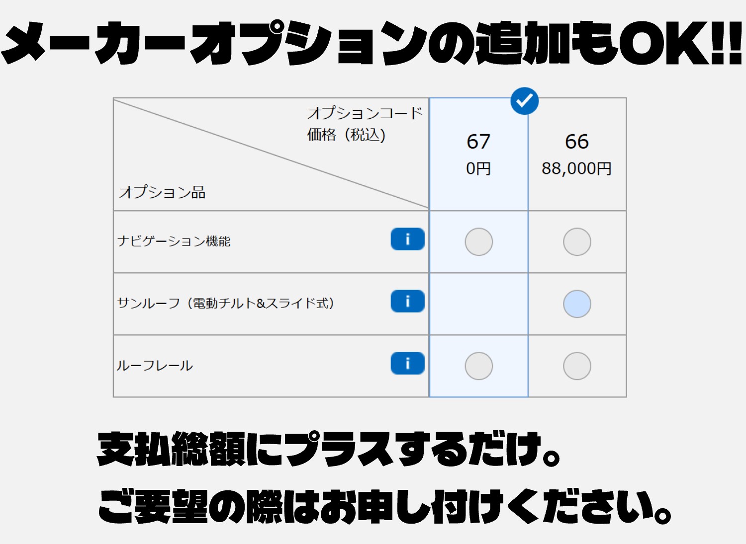 | 支払総額(税込) | 3,506,000 円 | 3,585,800 円 | 3,468,800 円 |