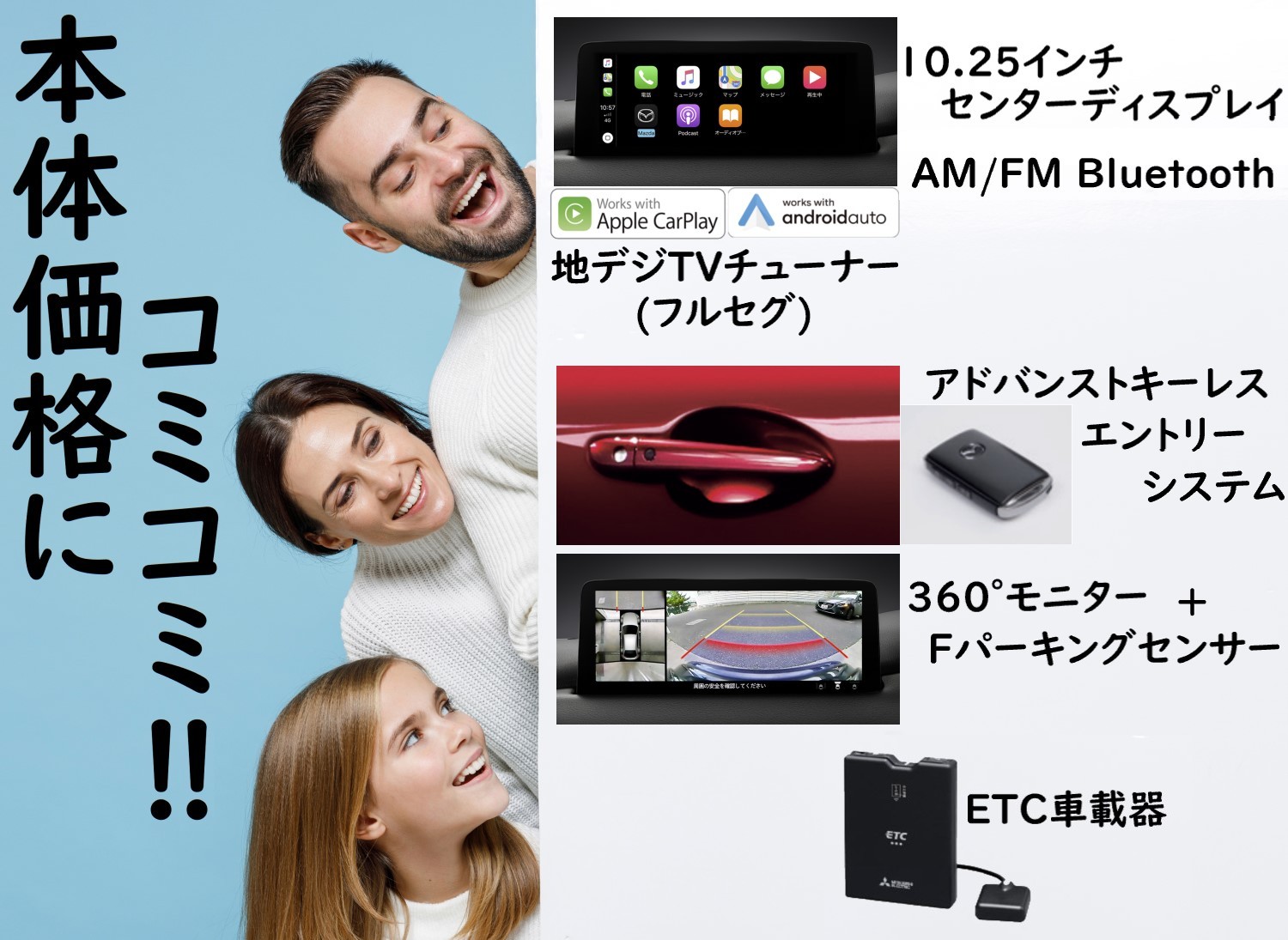 | 補足 | --- | 昨今、非常に需要が伸びてきましたドライブレコーダー。不意の事故もきちっと記録してくれます。GPS&Gセンサー搭載。クルマへの衝撃や振動で録画が始まります。駐車監視システム搭載。※価格は前後タイプです。 | おクルマの「輝き」「傷からの保護」「撥水効果」を長期間、良好に保ちます。保守状況や駐車場の状況にもよりますが3年から5年の効果を持続させます。気持ちよくおクルマを維持したい方に大好評です。 |